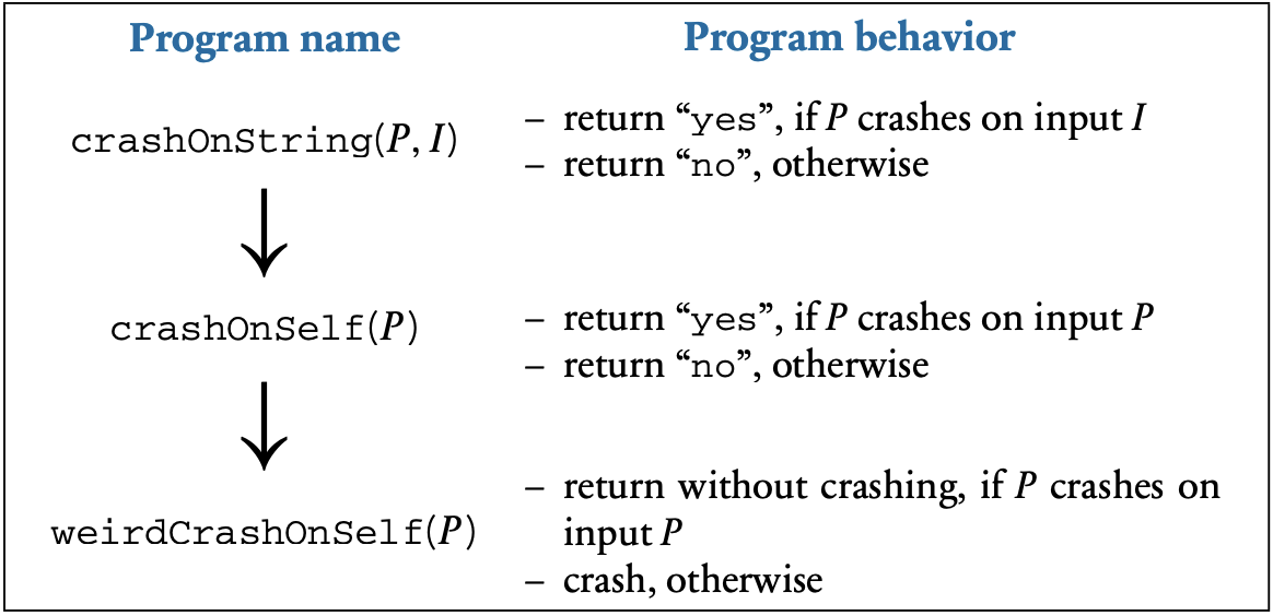 weirdCrashOnSelf isn’t possiblecrashOnString is possible. Then we could use it to write both crashOnSelf and weirdCrashOnSelf. Although, we know weirdCrashOnSelf is impossible therefore our assumption isn’t correct and crashOnString must also be impossibleweirdCrashOnSelf is impossible and causes a contradiction with crashOnStringcrashOnString is uncomputable (and untractable)weirdCrashOnSelf takes itself as an input it creates a contradiction with crashOnStringProofgrammers