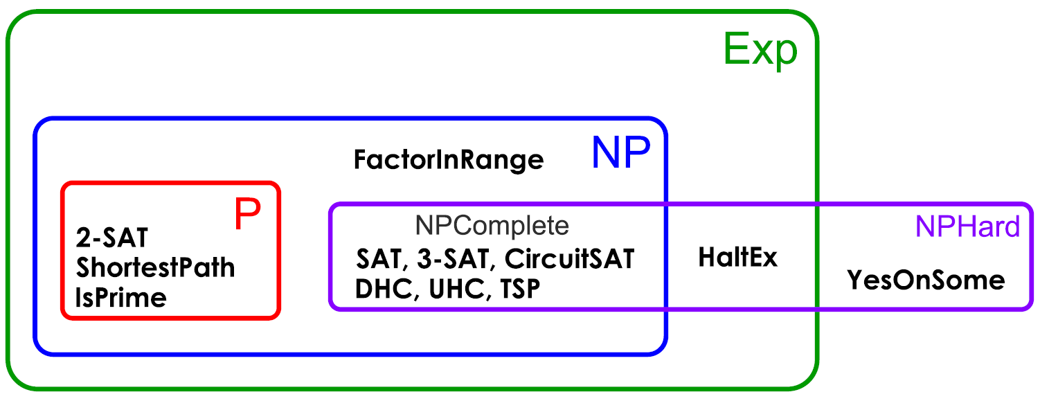 Understanding the hierarchy: P \(\subseteq\) NP \(\subseteq\) Expo is known, but whether these are proper subsets is still open. NP-complete and NP-hard problems are believed to be intractable but (as of yet) there is no formal proof!