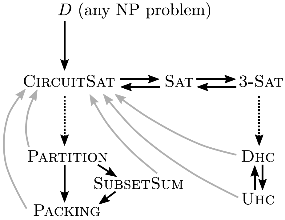 NP-completeness is transitive: \(A\) is NP-complete and \(A \leq_P B\) and \(B \in\) NP, then \(B\) is NP-complete. We now build a web of NP-complete problems!