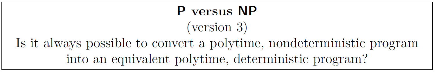 Nondeterminism captures parallel search: nondeterministic programs can explore all possibilities simultaneously. The question is whether this provides exponential speedup over deterministic search!