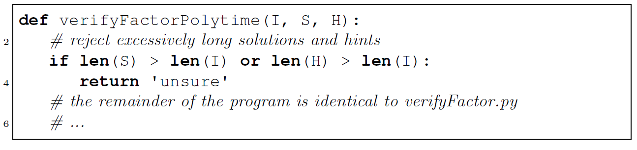 "a,b,1 b,c,2 c,a,3;8" with threshold \(L = 8\)"yes""a,b,c", which is the actual Hamilton cycle, hooray!"correct" in \(O(n^2)\) time!Polytime verifiers must protect against long inputs: if \(S\) has length \(2n\), just converting it to an integer takes \(2n\) steps, which is too expensive!