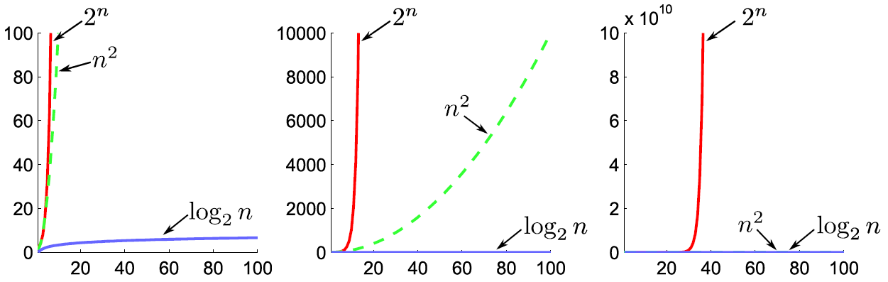 • Exponential time: \(2^n\), \(3^n\), \(n!\) (i.e., intractable for large \(n\))