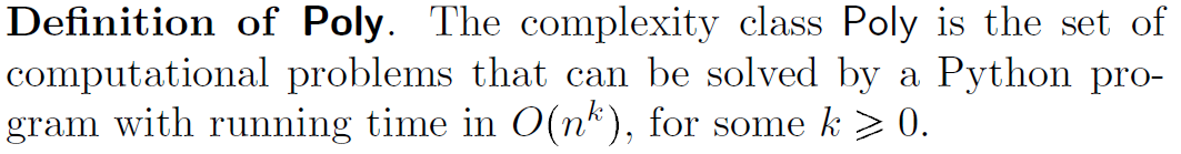 • Computational problem \(L\) is in Poly if solvable in polynomial time with a computable method