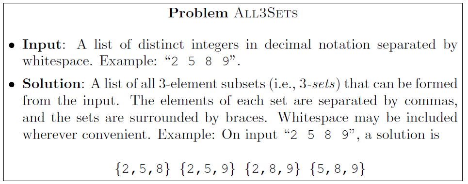 • All3Sets: given set \(S\), return all 3-element subsets