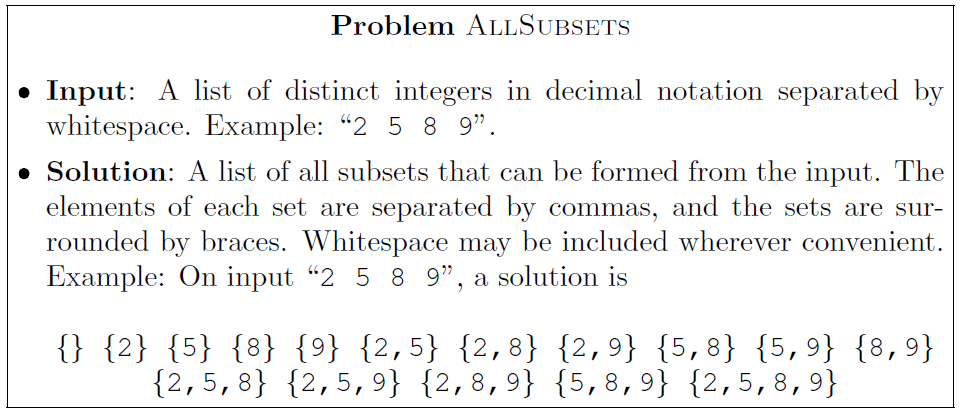 • AllSubsets: given set \(S\), return all subsets